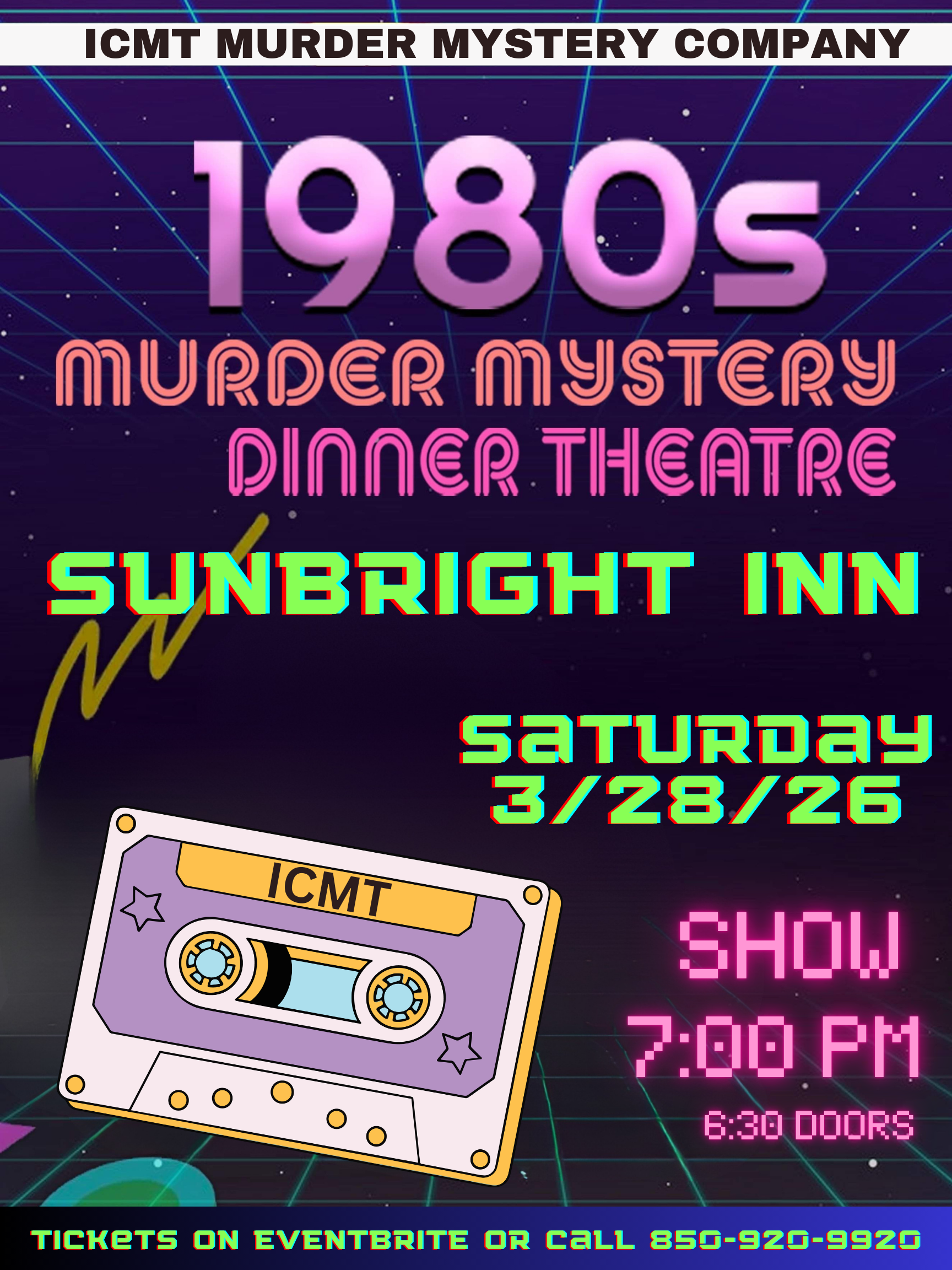 Make a reservation for the night of the mystery theatre event. Dates are listed above so therefore, book now while tickets last. Rooms will be part of the event. Any questions about rooms being part of the event, please contact Sunbright Inn at 850-920-9920. Use promotion code ICMT25 to get 10% off your room rate.